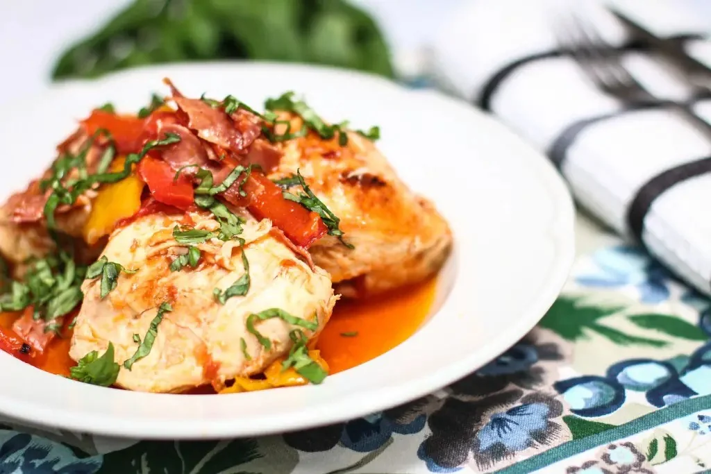 Pollo a la romana. Receta casera paso a paso con 1 pollo de 1,5 kg, 4 cdas. de aceite de oliva, 100 g de jamón crudo.